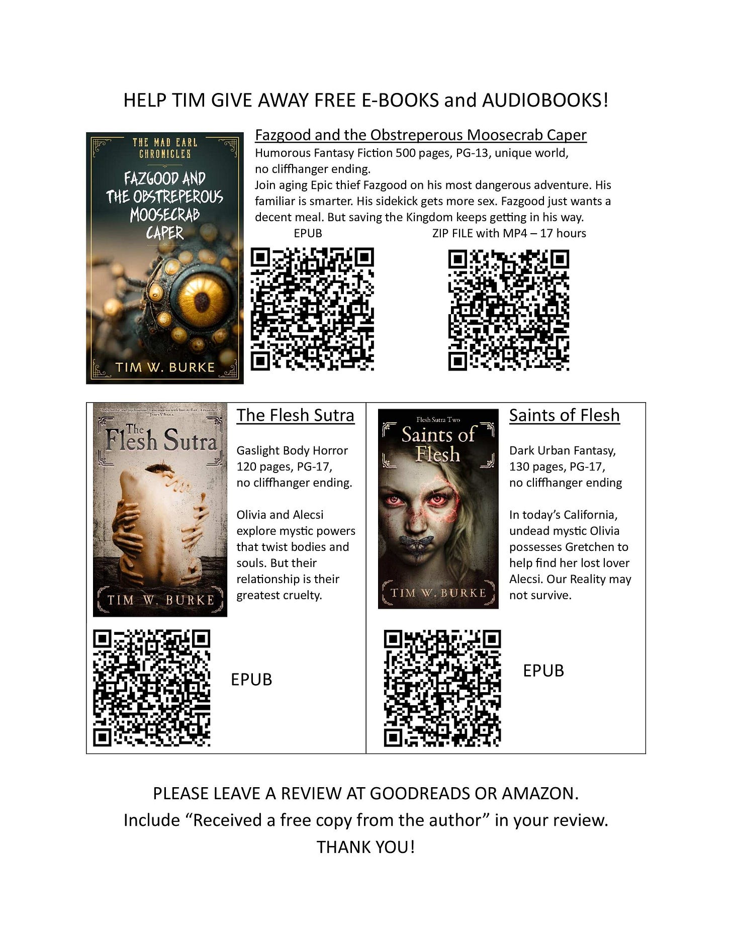 Would you like to read stories for free? Fazgood started as an AD&D character and turned into an Updike’s Rabbit with eldritch body humor. “The Flesh Sutra” was inspired by a heartbreak. Just scan these QR codes and you’ll download from Google Drive.